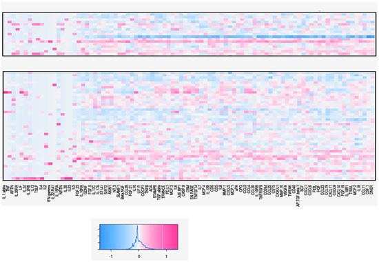 SIMs Heat Map. Proximity Extension Assay (PEA) technology (Proseek Multiplex Inflammation I Assay). The upper region contains Advanced Fibrosis (n = 17), and the lower region contains Non-Cirrhotic (n = 44) results. Each line represents a patient, and each column represents a SIM.