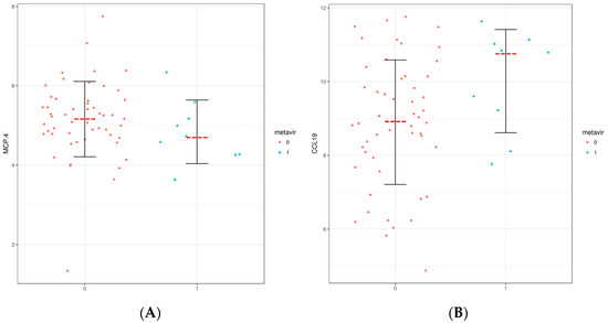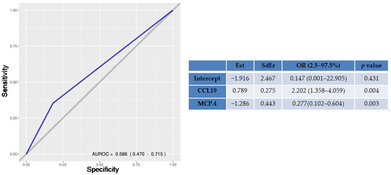 A logistic regression analysis was performed to compare hepatic biopsy results, considered the gold standard for the definition of degree of fibrosis in patients with chronic hepatic disease, with the SIMs quantified between the groups of patients with advanced-stage fibrosis and patients without fibrosis or in an early stage of disease. The independent variables for the final model were selected via backwise stepwise. It can be seen in Figure 3 that the cytokine CCL19 and the chemokine MCP.4, when analyzed together, presented an AUROC with a sensitivity of fibrosis stage differentiation of 80.9% when compared to the liver biopsy performed in the patients. Logistic regression also showed that the association between CCL19 (p = 0.004) and MCP.4 (p = 0.032) presented an odds ratio (OR) of 2.202.