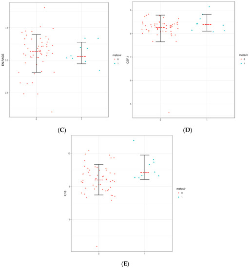 In the present study, of the seventy-four systemic inflammatory molecules analyzed, five were statistically significantly associated with the stage of liver fibrosis: MCP.4 (p = 0.032), CCL19 (p = 0.024), EN.RAGE (p = 0.014), SCF (p = 0.01), and IL18 (p = 0.054). To date, there have been no studies relating SIMs to the degree of fibrosis in Delta hepatitis; thus, these findings are novel.