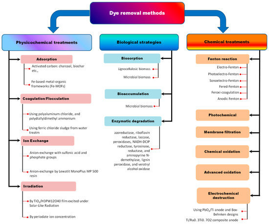 - Dutta, S.; Bhattacharjee, J. A comparative study between physicochemical and biological methods for effective removal of textile dye from wastewater. In Development in Wastewater Treatment Research and Processes; Elsevier: Amsterdam, The Netherlands, 2022; pp. 1–21. [Google Scholar]