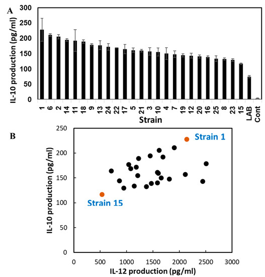 Cytokine-inducing activity of various B. subtilis natto strains. IL-10 production in THP-1 DC (A) and 2D-plots of IL-10 and IL-12 productions (B). “LAB” and “Control” indicate L. acidophilus JCM 1132 and medium, respectively.