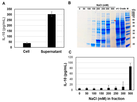 To confirm the presence of active components in the B. subtilis natto culture medium, we compared the activity of the supernatant of strain 1 fermented in TS medium and the surface layer proteins (Slps) released from the cell surface with 5 M LiCl in equal amounts of the cultured medium. IL-10-inducing activity in the supernatant of 1 culture medium (305 pg/mL) was 7.5 times higher than that in the 5M LiCl fraction (40 pg/mL) (Figure 2A). Therefore, strain 1 culture supernatant was selected for purification of the active component and fractionated with 5 mL of DEAE-Sepharose pre-equilibrated with 10 mM Tris-HCl, pH 7.5. As shown in Figure 2B, IL-10-inducing activity was significantly higher with 500 mM NaCl and Tris-Cl (Figure 2C). SDS-PAGE analysis revealed the presence of proteins in the 500 mM NaCl fraction (Figure 3B). We show here an approximately 60 kDa band, indicated by the red arrow, that was specific to the 500 mM fraction. The corresponding bands were extracted from the gel after SDS-PAGE, followed by trypsin digestion as described in the Section 2, prior to proteome analysis. Consequently, the 60 kDa protein was predicted to be GroEL, a chaperone protein that helps hold specific proteins intracellularly and interacts with mucin extracellularly after secretion [23].