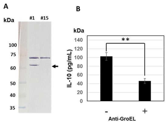 Western blotting analysis for B. subtilis strains 1 and 15 with anti-GroEL antibody (A) and inhibitory effect of IL-10-inducing activity of strain 1 supernatant by adding of anti-GroEL antibody (B). Arrow indicates specific band for GroEL. Significant difference between—antibody group and + antibody group. ** p < 0.01 (n = 3).