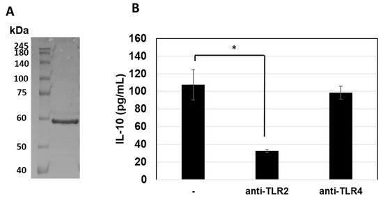 SDS-PAGE of the affinity-purified GroEL (A). Reduction of IL-10-inducing activity of GroEL by the treatments with anti-TLR2 and -TLR4 antibodies (B). Significant difference from the control (-), * p < 0.05 (n = 3).