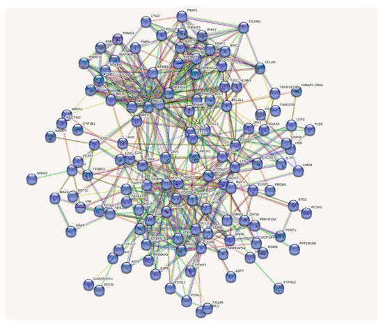 THP-1 cells were seeded at 5.0 × 104 cells per well in a 96-well culture plate and differentiated as described in Section 2.2. Briefly, THP-1 cells were cultured in 96-well plates at 5.0 × 104 cells per well by incubation with 100 nM phorbol 2-myristate 13-acetate for 3 days. Then, each well of THP-1 DCs was supplemented with 10 µL of purified GroEL fraction or PBS and incubated for 4 h at 37 °C under 5% CO2. The cells were washed with PBS, and total RNA was extracted. RNA sequencing was performed for two mixed groups from triplicate samples under three iterations: purified GroEL-treated and untreated groups, as described in Section 2.5. Compared to the control group, differentially expressed genes (DEGs) were selected using the criteria 1.4 < fold change and fold-change < 0.5, p < 0.05. Genes with an adjusted (fold-change) >1.4 were selected for network analysis. Molecular interactions between upregulated genes were visualised using STRING analysis.