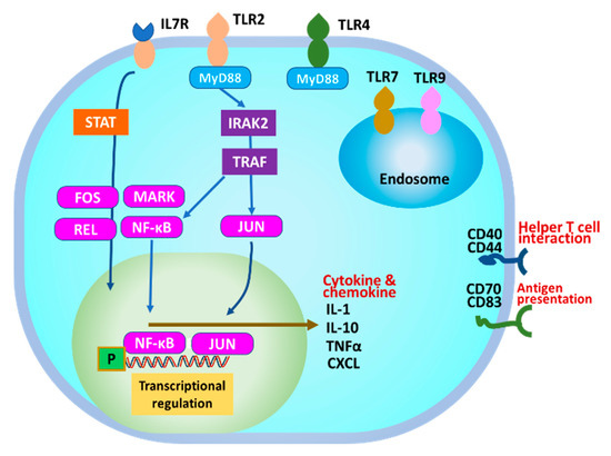 Here, we verified the IL-10-inducing activity of affinity-purified GroEL and its inhibition by the addition of an anti-GroEL antibody (Figure 4). Thereafter, we performed RNA sequencing of THP-1 DCs to determine the differences in gene expression between purified GroEL (n = 3) and PBS (control, n = 3) to elucidate the mechanism of action underlying the immunomodulatory effect of GroEL produced in B. subtilis natto strain 1. To screen DEGs, we juxtaposed the expression profiles of THP-1 DCs treated with GroEL and the control groups. As a result, 763 genes in the GroEL group were upregulated and 1375 genes were downregulated (data not shown) compared to those in the control group whereby DEGs were selected using the criteria 1.4 < fold change and fold change < 0.5, p < 0.05, respectively. Molecular interactions between the upregulated genes were visualised using STRING (https://string-db.org/, accessed on 18 September 2022) (available by request). Among the five predicted groups of networks (available by request), the main immunomodulatory responses were detected in the five major clusters. The possible interacting genes suggested to be involved in immune function (Cluster 5) are summarised in Figure 5. The interaction of GroEL with TLR2 on THP-DC may induce signalling pathways, such as IRAK and TRAF; in turn, several transcriptional regulators, such as FOS, MARK, REL, NFKB, and JUN, induce the transcriptions of IL-1, IL-10, TNFa, and several chemokines as illustrated in Figure 6.