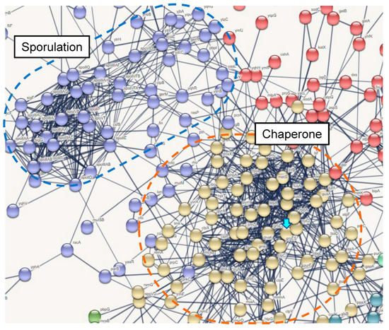 Network analysis for the upregulated genes in B. subtilis natto strain 1 compared to B. subtilis natto strain 15. Among whole networks, genes involved in Sporulation and Chaperone were showed by blue and red circles. GroEL was indicated by an arrow.