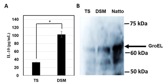 Numerous genes involved in sporulation were upregulated in B. subtilis 1. Therefore, we cultured strain 1 in DSM to induce sporulation and evaluated their IL-10-inducing activity as well as GroEL production against the TS medium. Ninety-two percent of strain 1 sporulated when it was cultured in DSM medium but did not sporulate in TS medium (3%). As shown in Figure 8A, the IL-10-inducing activity in THP-1 DC increased significantly (3.2-fold) when strain 1 cells were cultured in DSM compared to those cultured in TS medium. Furthermore, to assess the amount of GroEL prepared with strain 1 from the supernatants of TS and DSM, and the suspension of Natto product prepared with strain 1 in PBS, Western blotting analysis was conducted with an anti-GroEL antibody. As shown in Figure 8B, GroEL production in the culture supernatant was significantly higher in DSM than in TS. Interestingly, the amount of GroEL produced from Natto was the highest among the tested samples. These results strongly suggest that GroEL secretion in B. subtilis may be induced during sporulation and may contribute to cytokine production.