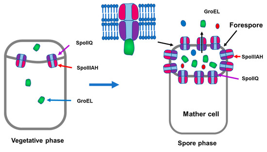 Predicted mechanism of GroEL secretion during B. subtilis strain 1 sporulation. Schematic representation of the hybrid transport system during endospore formation. SpoIIQ and SpoIIIAH are coloured purple and red, respectively. The predicted core components of transporter formed with SpoIIIAH and SpoIIQ through the forespore membrane.