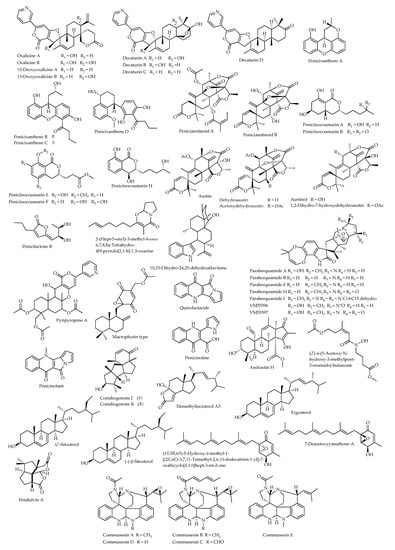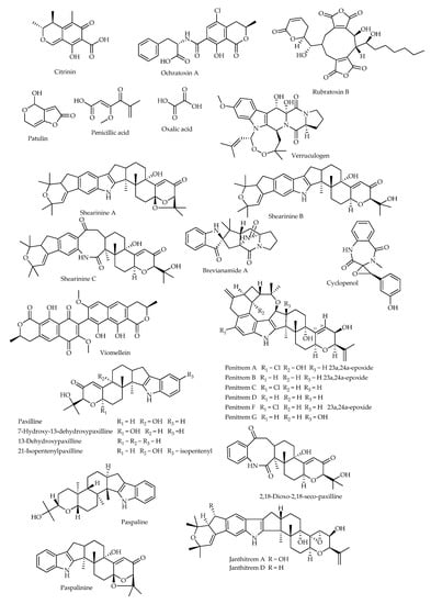 The above-considered entomopathogenic aptitude disclosed by some Penicillium spp. is thought to be basically related to the capacity by the infectious strains to synthesize bioactive compounds that can help to overcome the defensive barriers provided by the host’s immune system or influence its behavior and fitness [74]. This reasonable hypothesis has stimulated enormous research activity aiming to identify the candidate products that can be credited for these anti-insect properties and can be further investigated for possible application in various fields.