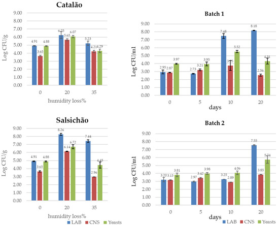 Natural evolution of LAB, CNS and yeasts in Catalão, Salsichão and Ciauscolo sausages as reported by Laranjo et al. [27] and Belleggia et al. [56]. A weight loss of 35%, corresponding to humidity loss, was reached in about 18 days for “Catalão” and in 35 days for “Salsichão”.