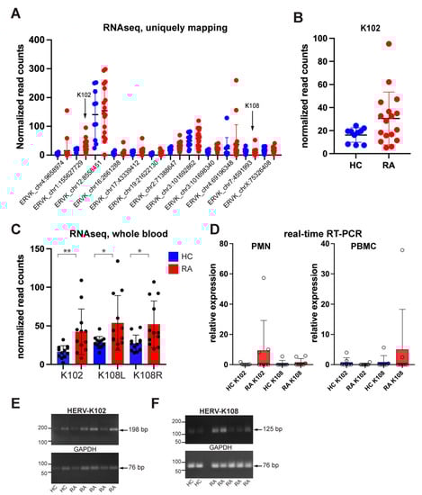 Endogenously expressed HERV-K loci in RA neutrophils. (A) All HERV-K transcripts present in neutrophils from RA patients (n = 17) and healthy controls (n = 10). (B) PCR amplification of HERV-K102 and K108 transcripts. (C) Independent validation by the GSE90081 RNA-Seq data set of the increased HERV-K102 and K108 transcripts in whole blood from RA patients (red) compared to healthy donors (HC; blue). No other HERV-K locus with an intact open-reading frame for Env was present in this data set. (D) Expression of transcriptional regulators of HERV-K, as indicated. (E) PCR to confirm K102 amplicon size, (F) PCR to confirm K108 amplicon size. * p < 0.05, ** p < 0.01.
