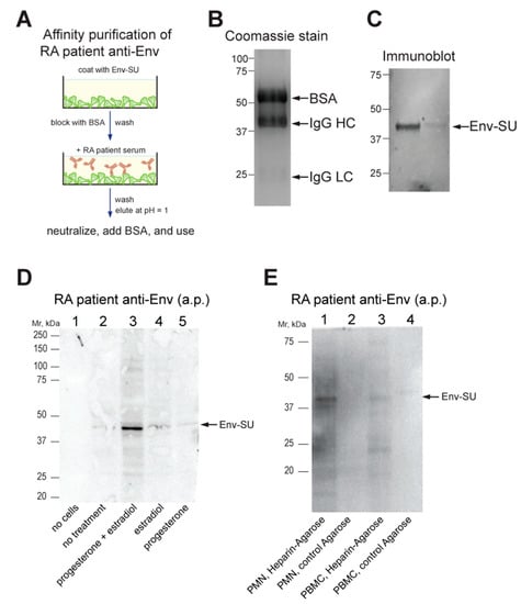 Detection of Env by patient antibodies. (A) Schematic illustration of our method of affinity-purification of RA patient anti-Env. (B) Coomassie Blue stain of the purified antibodies (with BSA). (C) Immunoblot of recombinant Env-SU using the affinity-purified antibodies. (D) Immunoblot using the affinity-purified antibodies of T47D breast cancer cells treated without or with hormones as indicated. (E) Immunoblot using the affinity-purified antibodies of material enriched by heparin-agarose or control agarose beads from the lysates of RA neutrophils (PMN) or PBMC, as indicated. a.p., affinity-purified; BSA, bovine serum albumin.