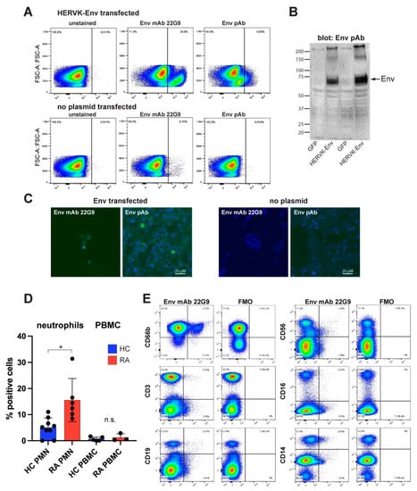 Having validated that the 22G9 mAb anti-Env is specific for Env, we used it to stain non-permeabilized immune cells from RA patients. By isolating both polymorphonuclear and peripheral blood mononuclear cells (PBMC) and analyzing them via a combination of lineage markers and the 22G9 mAb, we observed that neutrophils were the principal lineage expressing Env (Figure 3D,E). An average of 15.8% of RA neutrophils (n = 6) were positive compared to 5.0% of neutrophils from healthy donors (n = 9; p = 0.0026 via Mann–Whitney test) (Figure 3D). In contrast, PBMC from the same donors had very few positive cells, 0.68% in healthy individuals and 1.24% in RA patients (Figure 3D). This small difference was not statistically significant. In the representative flow cytometry shown in Figure 3E, the few Env-positive cells among the PMBC were found to be CD19+ B cells, CD56+ NK cells, and CD14+ monocytes from this RA patient. Their numbers are negligible compared to neutrophils.