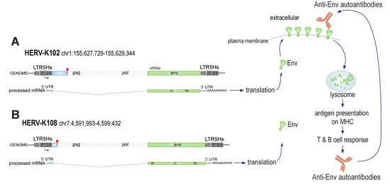 Schematic representation of the HERV-K102 and K108 loci, Env production, and anti-Env generation in RA patients. (A) Depicted are the HERV-K102 locus (red club = stop codon), the spliced transcript that encodes for Env, its translation, Env surface transport, and pathway to adaptive immunity leading to anti-Env autoantibodies that can recognize the intact surface-exposed Env. (B) The HERV-K108 locus, which has a longer leader sequence in env, may possibly contribute to detectable Env in neutrophils and other immune cell lineages.
