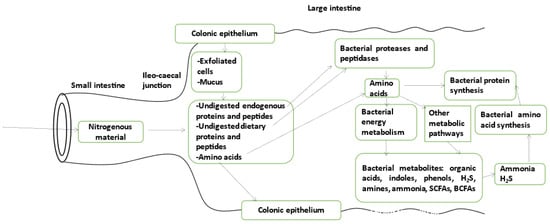 A minor part of undigested or not fully digested proteins, together with other nitrogenous compounds, can move from the terminal part of the ileum to the large intestine. Indeed, it has been estimated in volunteers that between 1.5 and 5 g of nitrogen are transferred every day through the ileo-caecal junction [5,6,7,8,9], with the major parts of this nitrogenous material being proteins and, to a much lesser extent, peptides, while the minor parts of this nitrogenous material are made of amino acids, urea, ammonia, nitrate, and other compounds [8]. Regarding peptides, it has been shown that these compounds are more rapidly absorbed in the small intestine than free amino acids [10,11]. Of note, the nitrogenous material recovered in the distal small intestine is not only originating from the diet but also from endogenous sources, including proteins present in the exocrine secretion, in the fully mature exfoliated enterocytes, and in the mucus layer released in the luminal fluid [12]. It has been determined that roughly 40% of the nitrogenous material transferred to the large intestine is from alimentation, while the remaining 60% is of endogenous origin [9].