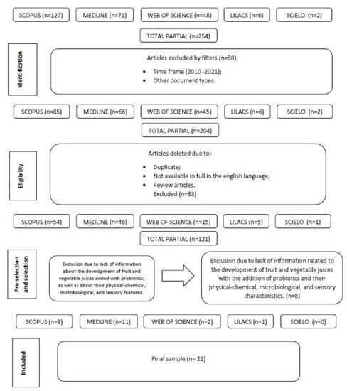 The initial search in the literature resulted in 254 articles associated with the herein selected keywords and descriptors. Then, articles published in duplicate were excluded in compliance with the adopted criteria. After the exclusion procedure was completed, 121 studies were considered eligible for the review. They were subjected to a pre-selection stage, according to which their title and abstract were assessed. Whether the selected studies were linked to the current research’s guiding question was also assessed at this stage. After the pre-selection process was completed, 29 articles were identified and assessed to check whether they provided information about the development of fruit and vegetable juices added with probiotics, as well as about their physicochemical, microbiological, and sensory features. After conducting a careful and objective assessment, 21 articles were selected and thoroughly evaluated. They were organized based on the categories of collected information (title, author, year, journal, sample, material and methods, and main results). A flowchart of the steps taken from the bibliographic survey to article selection is shown in Figure 2.