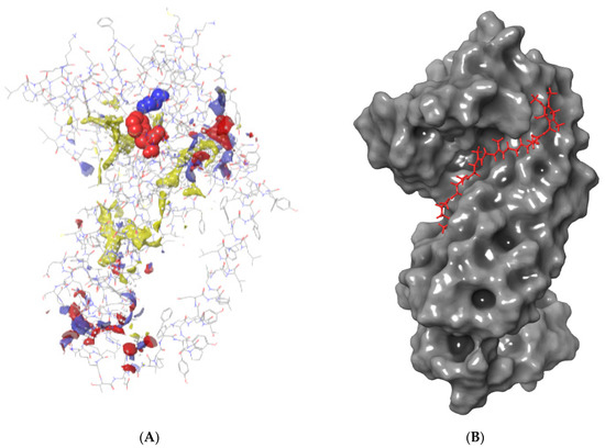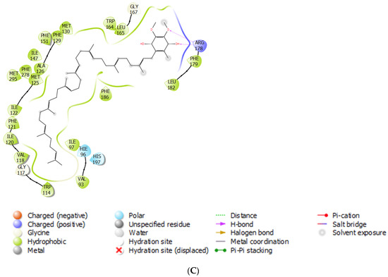 (A) Site map output depicting possible binding sites of Plasmopara viticola cytochrome b (G143—blue residue; F129—red residue; hydrophobic—yellow areas; hydrogen-bonding acceptor—red areas; hydrogen-bonding donor—blue areas); (B) the top orientation of ubiquinol on cytochrome b (ubiquinol—red sticks; WT cytochrome b—gray surface); and (C) key interactions of ubiquinol with cytochrome b amino acid residues.