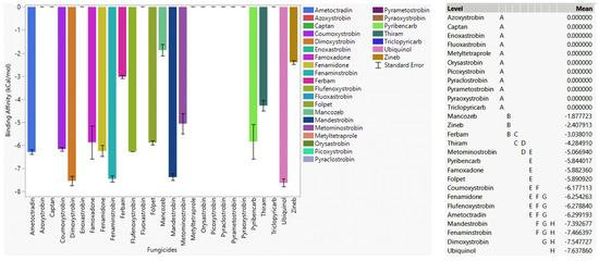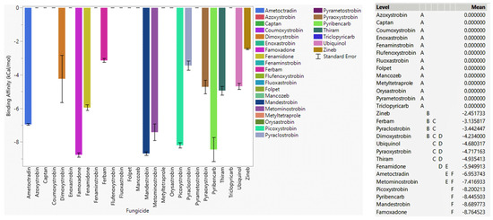 The performance of selected QoI fungicides on G143A-mutated cytochrome b of Plasmopara viticola in a specific grid box. Mean—average binding affinity of three replicates (generated by Glide docking on Maestro Schrödinger) of the corresponding ligand; level—ligands with the same letter level are not significantly different (letter level A: ligands with the lowest binding affinity; letter level H: ligands with the highest binding affinity).