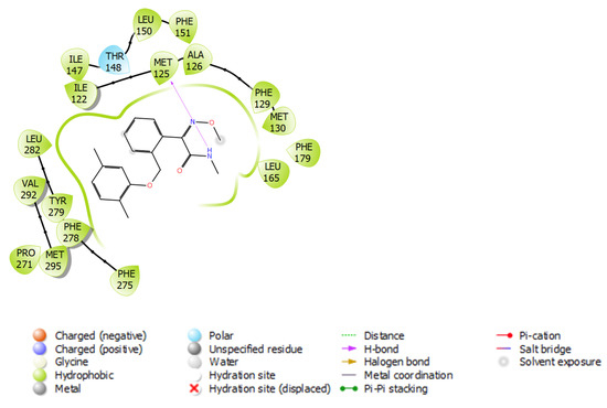 The top conformation interactions of the highest affinity fungicides with G143A-mutated versions are given in Figure 4. Dimoxystrobin showed strong hydrophobic and hydrogen bonding interactions with MET125 of G143A-mutated cytochrome b. It was evident that the primary interactions between fungicides and cytochrome b were hydrophobic, which agreed with the predominantly hydrophobic nature of cytochrome b proteins [36,37]. Figure 4 shows dimoxystrobin forming strong hydrophobic interactions with the ILE122-ILE147 and PHE275-MET295 regions in the G143A-mutated versions. Of the low-risk fungicides, thiram showed strong hydrophobic interactions with cytochrome b.