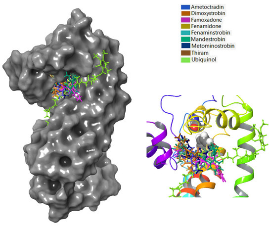 Based on the binding analysis (Figure 5), the pocket located on the top region of cytochrome b that contained the residues F129 and G143 seemed to be an important binding position when targeting Plasmopara viticola inhibition. Ametoctradin, famoxadone, fenamidone, fenaminstrobin, mandestrobin, dimoxystrobin, metominostrobin, and thiram tended to bind to this pocket, including the native substrate ubiquinol.