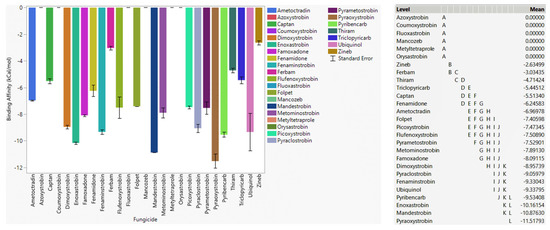 The performance of selected QoI fungicides on WT cytochrome b of Plasmopara viticola in a specific grid box. Mean—average binding affinity of three replicates (generated by Glide docking on Maestro Schrödinger) of the corresponding ligand; level—ligands with the same letter are not significantly different (letter level A: ligands with the lowest binding affinity; letter level I: ligands with the highest binding affinity).