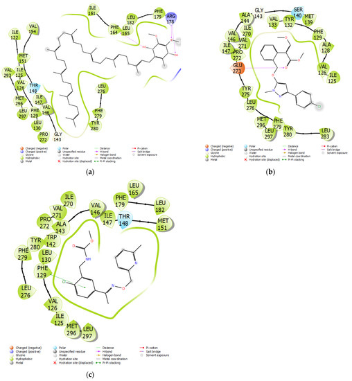 (a) Ubiquinol and (b) Pyraoxystrobin interactions with WT cytochrome b, and (c) Pyribencarb interactions with the G143A mutation of cytochrome b of Botrytis cinerea.