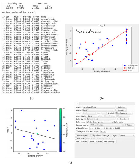 (a) Model report for the pls_19 model, (b) scatter plot providing the performance for the pls_19 model, and (c) scatter plot of the prediction set for the top QSAR models in Figure S1 for Botrytis cinerea without using a validation set.