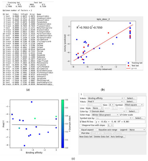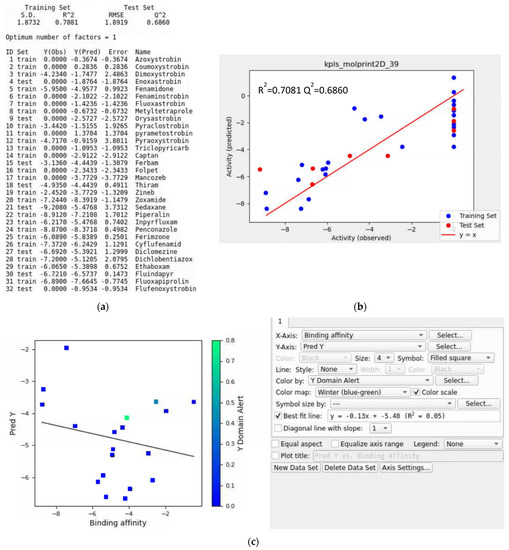 (a) Model report of the kpls_linear_39 model, (b) scatter plot providing the performance of the kpls_linear_39 model, and (c) scatter plot of the prediction set for the top QSAR models in Figure S16 for Plasmopara viticola using a validation set.