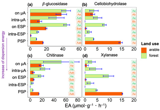 Soil enzyme activities (X axes, μM MUF (g−1 soil hour−1)) of (a) β-glucosidase, (b) Cellobiohydrolase, (c) Chitinase, and (d) Xylanase determined in soil suspensions, separated from A horizons of arable and forest Phaeozems with increasing dispersion energy (Y axes): on µA—from the surface of microaggregates, intra-µA—within microaggregates, on ESP—from the surface of elementary soil particles, intra-ESP—within elementary soil particles, and PSP—associated with primary soil particles. Values are mean ± SE (n = 4). Values followed by a different lowercase letter represent a significant difference between types of suspension. Values followed by a different capital letter represent a significant difference among land use types.