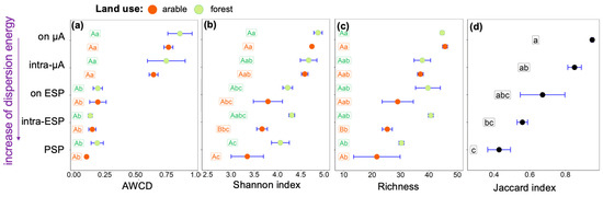 Microbial metabolic activity and diversity characterized by (a) Average well colour development (AWCD), (b) Shannon diversity index (X axis), (c) Richness (X axis), (d) Jaccard index (X axis), determined in in soil suspensions separated from A horizons of arable and forest Phaeozems with increasing dispersion energy (Y axes): on µA—from the surface of microaggregates, intra-µA—within microaggregates, on ESP—from the surface of elementary soil particles, intra-ESP—within elementary soil particles, and PSP—associated with primary soil particles. Values are mean ± SE (n = 4). Values followed by a different lowercase letter represent a significant difference between types of suspension. Values followed by a different capital letter represent a significant difference among land use types.