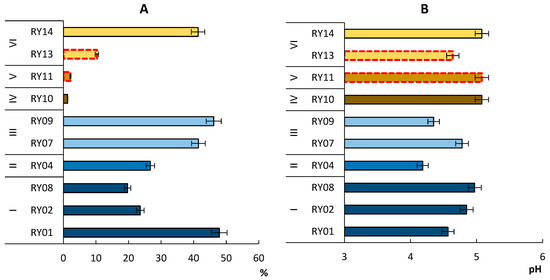 The proportion of mycelium in the total fungal biomass changed greatly depending on the type of biotope. It is minimal—14–15%—in terms of fungal biomass in soils of cryogenic spot (RY10) and Entic Podzol (RY08), and maximum—68–78%—in terms of fungal biomass in Entic Podzol (RY01) and Albic Podzol (RY09). The length of fungal mycelium in the soils also varied greatly. It was comparable to that in the soils of the north of Novaya Zemlya [33], but less than on the coast of the Barents Sea [31]. Its lowest values were 14 and 29 m/g of soil in soils of cryogenic spot (RY10), and the highest, 413 m/g of soil, was found in Albic Podzol (RY09) (Table S1). We assume that the TOC content, pH values and type of vegetation cover can primarily explain such a difference in the length of the fungal mycelium for different types of biotopes.