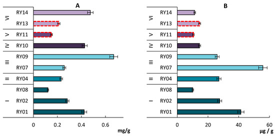 The amount of TOC in the Entic Podzol and Albic Podzol was quite large and reached 47.86% by weight, in the Rheic Histosol—26.67% by weight (Figure 2). Such differences in the content of organic matter in tundra were caused by the differences in type of phytocenoses and the degree of humification of litter. At the same time, in areas under meadow vegetation, the content of TOC in Folic Histosol (RY11) was lower and did not exceed 2.14%.