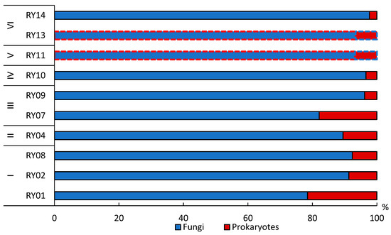 The proportion of fungi and prokaryotes based on biomass of Rybachy Peninsula soils. Skeletic Folic Leptic Entic Podzol (I), Rheic Leptic Rockic Histosol (II), Skeletic Folic Leptic Albic Podzol (III), Skeletic Leptic Entic Podzol—cryogenic spot (IV), Leptic Hemic Folic Histosol (Technic) (V), Leptic Hemic Folic Histosol (VI). The red dotted line indicates anthropogenically modified areas.