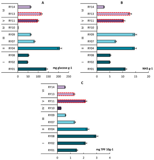 The dehydrogenase activity was maximum in the Entic Podzol in moss and lichen tundra at the top of the hill (RY08). Entic Podzol in shrub tundra and crooked birch forest (RY01, RY14) and Albic Podzol (RY09) were characterized by lower values of dehydrogenase activity (Figure 5C).