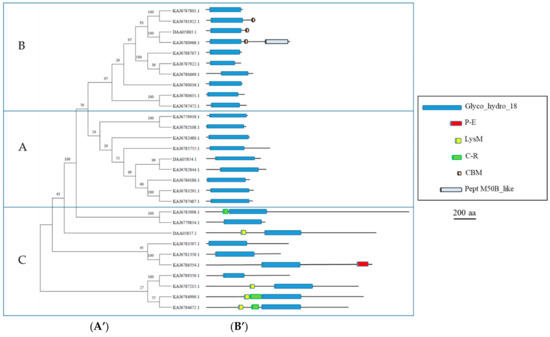 Phylogenetic and structural analyses of A. album GH18 chitinases. (A’) Phylogenetic tree of the A. album GH18 chitinases, indicated by their accession number, and three GH18 sequences from H. jecorina (DAA05865, DAA05854, DAA05857). (A–C) indicate the three subgroups of fungal GH18 chitinases [30]. Phylogenetic analysis was carried out by MEGA11. Bootstrap values are reported close to nodes. (B’) Graphical representation of the functional domains identified by HMMER in the chitinase sequences (description in the figure inset). Details on the precise location and length of the identified regions are reported in Table S1. Insert legend (corresponding PFAM IDs are reported in brackets): Lys = LysM domain (PF01476); C-R = Chitin recognition protein (PF00187); GH18 = Glycosyl hydrolases family 18 (PF00704); CBM = Fungal cellulose-binding domain (PF00734); Pept_M508 = Peptidase M50B-like (PF13398); P-E = Pathogen effector; putative necrosis-inducing factor (PF14856).