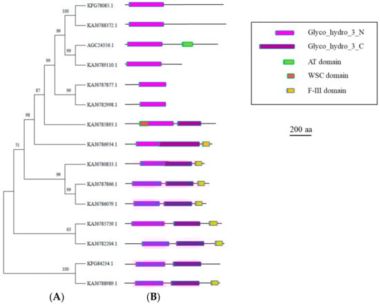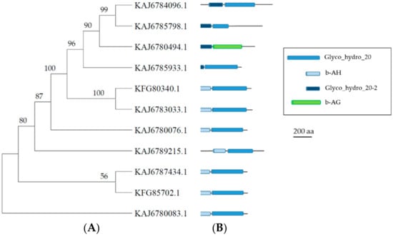 Candidate genes for chitinolytic enzymes in the A. album genome were identified as those containing a “Glyco_Hydro_3 (or 18, 20, 75)” protein domain according to the PFAM annotation and the CAZy classification of glycoside hydrolase (GH) families [18]. Sequences belonging to the GH3, GH18, GH20, and GH75 families were then manually extracted.