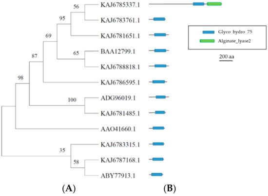 Phylogenetic and structural analyses of A. album GH75 sequences. (A) Phylogenetic tree of the A. album GH75 sequences, indicated by their gene number, and the chitosanases from A. fumigatus (AAO41660), F. solani (BAA12799), G. sp. JG-2005 (ABY77913), and P. chrysogenum (ADG96019.1). Bootstrap values are reported close to nodes. (B) Graphical representation of the functional domains identified in the protein sequences (description in the figure inset). Details on the precise location and length of the identified regions are reported in Table S4. Insert legend (PFAM IDs are reported in brackets): GH75 = Fungal chitosanase of glycosyl hydrolase group 75 (PF07335); A–L = Alginate Lyase (PF08787).
