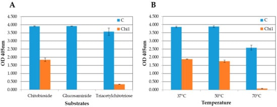 A second assay was carried out at different temperatures using 4-Nitrophenyl N-N′-diacetyl-β-D-chitobioside as the substrate. rChi1 showed about the same activity at 37 °C and 50 °C, while at 70 °C, the activity decreased (Figure 5B).