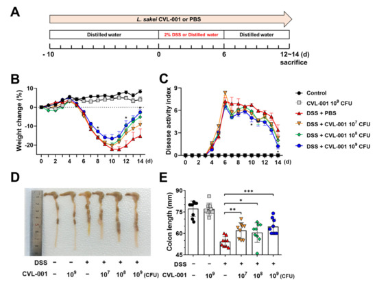 To determine the potential protective effects of L. sakei CVL-001 against DSS-induced colitis, mice were administered various L. sakei CVL-001 doses according to the experimental schedule shown in Figure 1A. DSS-treated groups exhibited body weight loss and clinical signs, such as diarrhea and bloody feces (Figure 1B,C). Administration of L. sakei CVL-001 improved the loss of body weight and disease activity in a dose-dependent manner, and there was a significant difference between phenotypes of the PBS-treated group and those of the group treated with a high dose (109 CFU) of the bacterium among the DSS-treated mice (Figure 1B,C). Moreover, L. sakei CVL-001 administration helped recover the shortened colon length in mice (Figure 1D,E), which is a characteristic feature of DSS-induced colitis [17].