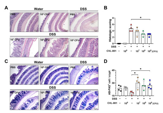 Histopathological analysis revealed that compared with the non-DSS groups, those that received DSS treatment exhibited increased infiltration of inflammatory cells into the lamina propria and disruption of the colon’s epithelial layer (Figure 2A,B). Furthermore, the histopathologic severity induced by DSS treatment was ameliorated by L. sakei CVL-001 administration in a dose-dependent manner. Additionally, the PBS-treated group and the group treated with 109 CFU of L. sakei CVL-001 among the DSS-treated mice exhibited a significant difference (Figure 2A,B). AB-PAS staining was performed to investigate epithelial barrier function based on mucus secretion ability. Compared with the PBS-treated group, the groups that were administered 107 and 109 CFU of L. sakei CVL-001 exhibited a significantly higher number of mucus-secreting cells (Figure 2C,D). These results suggest that the oral administration of L. sakei CVL-001 alleviates DSS-induced colitis in mice.