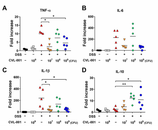 3.2. Anti-Inflammatory Effect of L. sakei CVL-001 against DSS-Induced Colitis