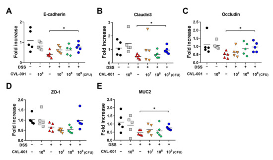 Various probiotics can prevent intestinal diseases by improving intestinal barrier function [18,19]. Accordingly, we further examined the effect of L. sakei CVL-001 on intestinal barrier function by measuring gene expression levels of adherens junction proteins (E-cadherin), epithelial tight junction proteins (claudin-3, occludin, and zonula occludens [ZO]-1), and mucin (MUC) 2. The mRNA expression levels of the genes coding for E-cadherin, claudin-3, occludin, and ZO-1 proteins were lesser in the DSS-treated groups than in the non-DSS groups (Figure 4A–D). However, the levels of genes coding for E-cadherin, claudin-3, and occludin were significantly restored by administration of 109 CFU of L. sakei (Figure 4A–C). The mean level of ZO-1 gene expression was also increased via administration of 109 CFU L. sakei CVL-001, although the difference was not significant (Figure 4D). To evaluate mucus-secreting ability, we measured the mRNA expression levels of MUC2, which were reduced in DSS-treated mice, but restored by administration of 109 CFU of L. sakei CVL-001 (Figure 4E). These findings suggest that the administration of L. sakei CVL-001 may alleviate ulcerative colitis by improving intestinal barrier function.