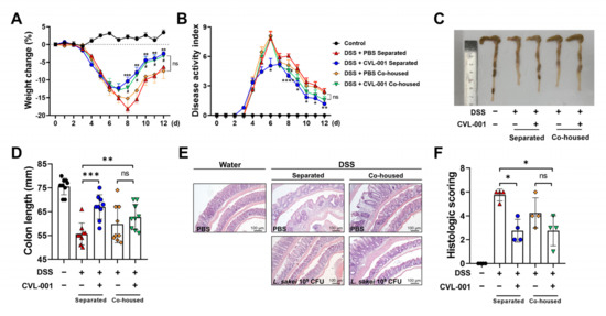 The co-housing technique is one of the microbiota transfer techniques that utilizes the habits of mice. Mice in the same cage consistently exchange microbiota through coprophagy, grooming, and other social interactions. After co-housing for the period of the experiment, the microbiota composition of two distinct groups will be similar. This technique has been widely accepted to investigate the role of the microbiota in various physiological and pathological conditions [37,38,39]. In our study, we investigated the microbiota-mediated protective effect of L. sakei CVL-001 using the co-housing technique. In a separate condition, L. sakei CVL-001 administration still improved recovery against DSS-induced colitis. However, in co-housed conditions, the PBS and L. sakei CVL-001 treatment groups did not exhibit significant differences in clinical and pathological scoring. These data suggest that the altered microbiota achieved by the co-housing might have contributed to an impaired protective effect compared with the separated group. Taken together, the microbiota modulated by L. sakei CVL-001 administration contribute to a protective effect against DSS-induced colitis.