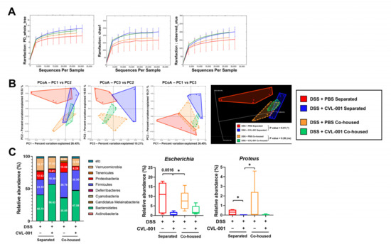To identify microbiota alterations, the abundance and composition of gut microbiota were analyzed through OTU analysis using the 16S bacterial rRNA gene. Alpha diversity analysis revealed that L. sakei CVL-001 administration led to increased mean levels of alpha-diversity metrics on PD_whole_tree, Chao1, and observed_OTUs, which related to the abundance of gut microbiota in DSS-treated mice, regardless of co-housing; however, there was no statistically significant difference (Figure 6A). The alpha diversity of PBS-treated mice in the co-housed group was also at slightly higher mean levels than that of the separated group (Figure 6A). Principal coordinate analysis (PCoA) was performed to quantify the compositional difference of the microbiota among the groups. In the separated groups, clusters in the PBS-treated group were distinct from those in the L. sakei CVL-001-treated group (p = 0.01), suggesting that L. sakei CVL-001 administration can significantly alter the structure of gut microbiota in unweighted UniFrac distance (Figure 6B). In contrast, the two co-housed groups showed similar clusters (p = 0.26), and were relatively similar to those of the L. sakei CVL-001-treated groups in separate cages (Figure 6B).