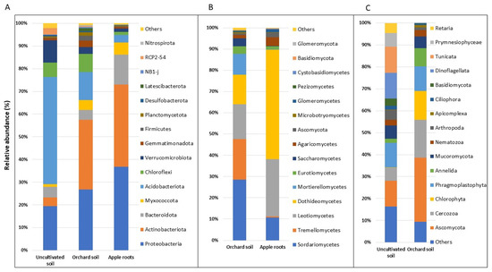 Relative abundances of (A) bacterial, (B) fungal, and (C) eukaryotic taxa were detected in apple root, cultivated orchard soil, and uncultivated bulk soil. Uncultivated bulk soil sample data were from Yurgel et al. [22]. Data of cultivated orchard soil and apple tree roots are referred to six mature apple orchards, each with 6 sub-samples.