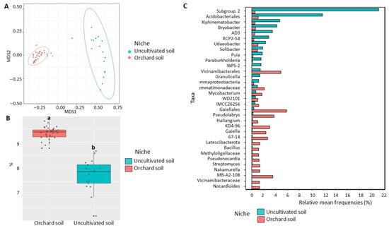 Diversity of bacterial communities in the orchard and uncultivated soil. (A) Non-metric multidimensional scaling (NMDS) based on Bray–Curtis distances. (B) Shannon diversity index (data followed by different letters are significantly different according to Kruskal–Wallis at p < 0.05. (C) Differentially represented bacterial taxa with a relative frequency > 1%. Data of uncultivated bulk soil samples were from Yurgel et al. [22]. Data of cultivated orchard soil were referred to six mature apple orchards, each with 6 sub-samples.