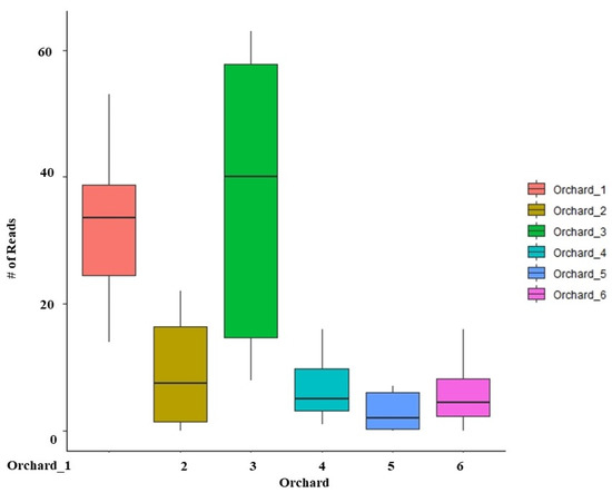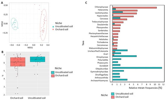Eukaryotic community: There was a strong separation in the NMDS plot between the orchard soil microbiome and the uncultivated soil microbiome (Figure 3A). According to Kruskal–Wallis test, there was no significant difference (p > 0.05) in Shannon diversity of the eukaryotic community between the orchard and the uncultivated soils (Figure 3B). However, the analysis of variance showed a significant difference between sampling niches. In total, 30% of eukaryotic community variation (p < 0.01) was observed between the orchard soil microbiome and the uncultivated soil microbiome (Table 1). This strong community variation was accompanied by a significant difference (p < 0.05) in eukaryotic community composition. More specifically, 75 eukaryotic classes were differentially represented. (Table S3). These included highly abundant Sordariomycetes, Chlorophyceae, Glissomonadida, Leotiomycetes, Dothideomycetes, and Cercomonadidae, with Appendicularia, Dinophyceae, Prymnesiophyceae, Acantharia, and Archaeorhizomycetes being relatively under-represented in orchard soil when compared with uncultivated soil (Figure S2B).
