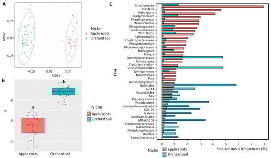 Diversity of bacterial communities in the apple roots and orchard soil. (A) Non-metric multidimensional scaling (NMDS) based on Bray–Curtis distances. (B) Shannon diversity index (data followed by different letters are significantly different according to Kruskal–Wallis at p < 0.05. (C) Differentially represented bacterial taxa with a relative frequency >1%. Data of cultivated orchard soil and apple tree roots were referred to six mature apple orchards, each with 6 sub-samples.