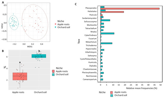 Diversity of fungal communities in the apple roots and orchard soil. (A) Non-metric multidimensional scaling (NMDS) based on Bray–Curtis distances. (B) Shannon diversity index (data followed by different letters are significantly different according to Kruskal–Wallis at p < 0.05. (C) Differentially represented fungal taxa with a relative frequency > 1%. Data of cultivated orchard soil and apple tree roots were referred to six mature apple orchards, each with 6 sub-samples.